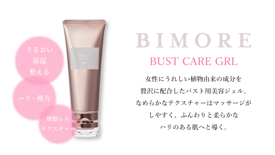 そして、マッサージと保湿ケアが、バストのハリと弾力を育みます。今回ご紹介した「BIMORE BUST CARE GEL」などのバスト用アイテムも活用し、今日から丁寧なバストケアを始めてみませんか。