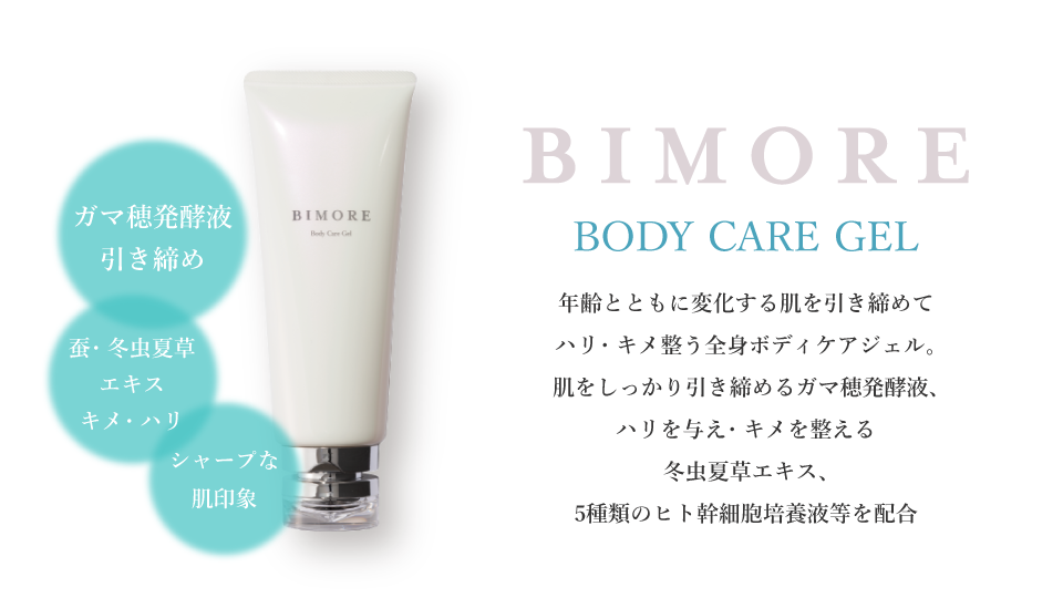 乾燥によるダメージを受けやすい秋冬は、マッサージ前に保湿をしてあげることで摩擦レスケアが出来ます。そこで私がおすすめしたい必須アイテムが「BIMOREのボディケアジェル」。「冬虫夏草エキス*¹」と「5種類のヒト幹細胞培養液*²」が配合されているため、保湿ケアとエイジングケア*³も叶うアイテムです。「ガマ根発酵液*⁴」配合により、肌の引き締めやなめらかに整えてくれるため、マッサージとの相性がいいのもポイントです。