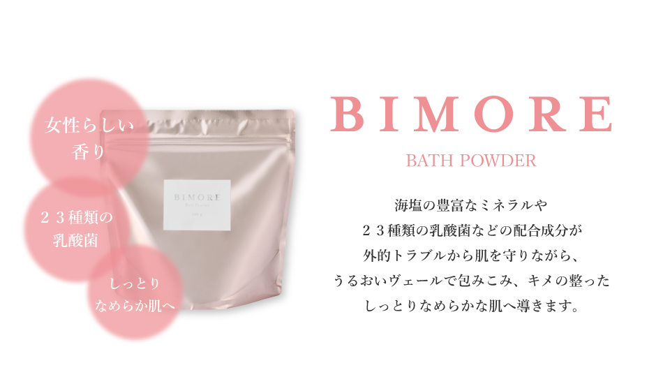 なるべく肌を乾燥させないためには、入浴剤を使うのがおすすめです。ビモア バスパウダーはフェムケア視点で作られており、ミネラルたっぷりの海塩をベースに使用しています。さらに3種の整肌成分*1を配合し、キメの整ったうるおいのあるなめらかな肌へ導きます。まずは、湯船に浸かって身体を温めながら、香りに恋するバスタイムを。女性らしい甘く濃厚な香りで、一日頑張った身体と心を緊張から解き放しましょう。