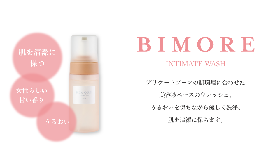 身体も心も温まったあとは、ビモア インティメイトウォッシュを使って丁寧に洗いましょう。デリケートゾーンの肌環境に合わせて作られた美容液ベースの専用ウォッシュで、2種類の乳酸菌*2が配合されており、肌を健やかに保ちます。泡タイプなので摩擦レスで洗え、フェムケア初心者の方でも取り入れやすいアイテムです。女性らしいフローラルの香りが心地よく、毎日自然と使いたくなりますよ。