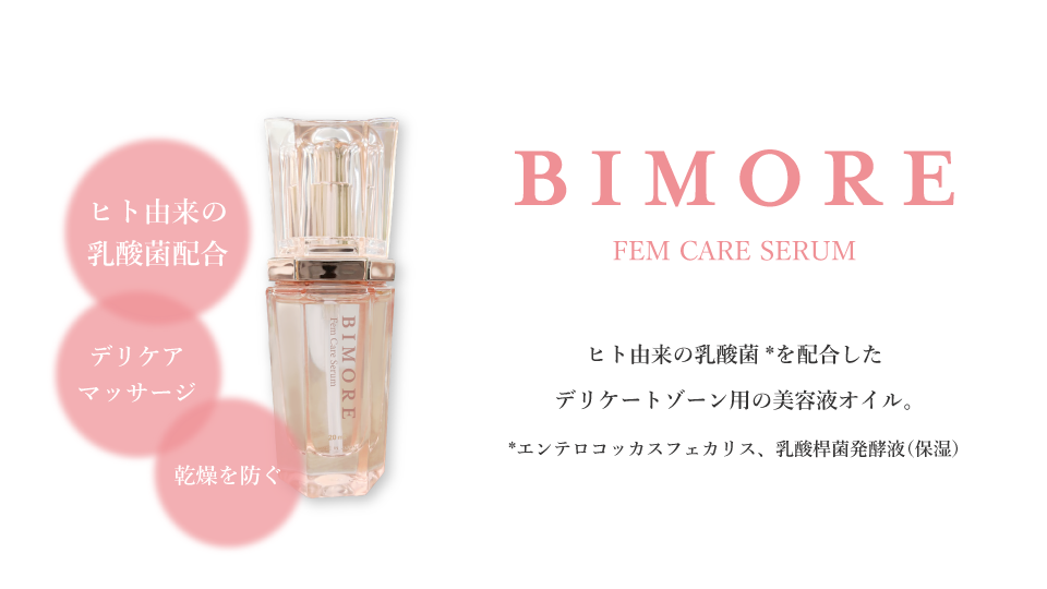 デリケートゾーンの環境に着目して開発されたビモア フェムケアセラムは、繊細な膣まわりの保湿にぴったり。ホホバ種子油を含む10種類の植物オイル*3、ヒト由来の乳酸菌*4、緑藻エキス*5を贅沢に配合し、肌なじみのよさが魅力です。肌の柔らかさを保ち、うるおいを与え、デリケートゾーンをトラブルから守ります。べたつかないさらりとしたテクスチャーなので、マッサージにもおすすめです。
